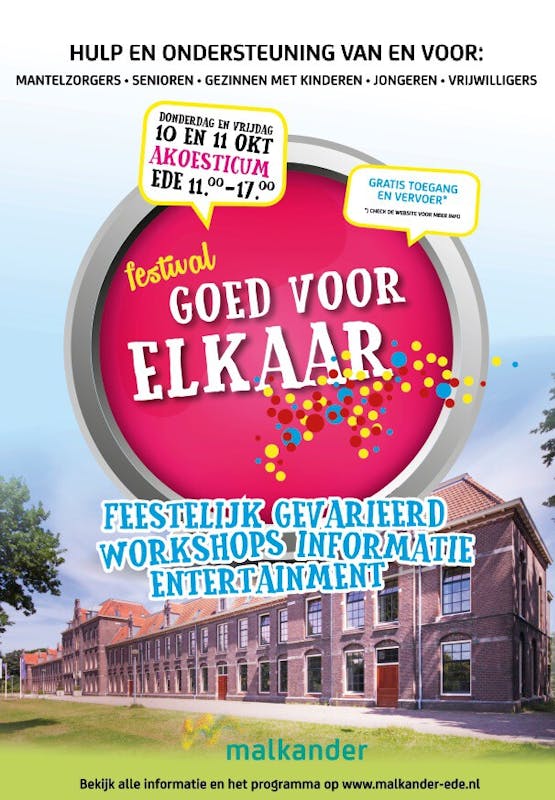 . Festival Goed voor Elkaar wordt dit jaar voor het eerst georganiseerd ter vervanging van de Mantelzorgbeurs, de Vrijwilligersbeurs en de Seniorenbeurs. “Door krachten te bundelen onderstaat er een echt festival gevoel, waar bezoekers alles op één plek kunnen vinden”, aldus Gea den Hartog van Malkander.