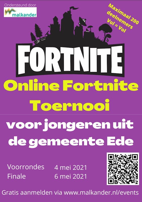 Vandaag zijn de twee voorrondes van het Online Fortnite Toernooi in de Meivakantie. De eerste voorronde is van 14:00 - 16:00, de tweede voorronde is van 18:00 - 20:00. Aanmelden voor het Fortnite toernooi kan tot en met zondag 25 april. Inschrijven kan via de volgende link: https://www.malkander-ede.nl/evenementen-/fortnite-toernooi-meivakantie-2021.aspx