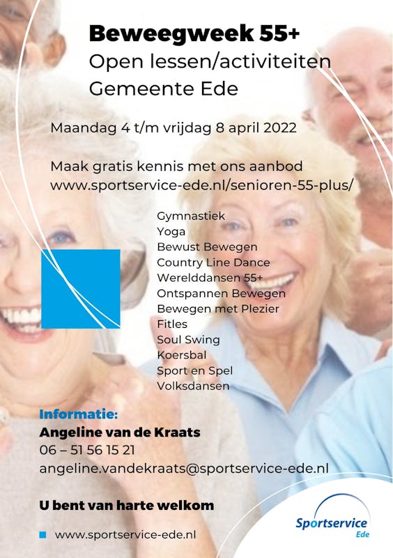 Wie kennis wil maken met één van de lessen of daar graag meer informatie over wil kan contact opnemen met Angeline van de Kraats van Sportservice Ede via 06 -51 56 15 21 of stuur een e-mail naar . Een overzicht van al het aanbod staat op www.sportservice-ede.nl/senioren-55-plus/.