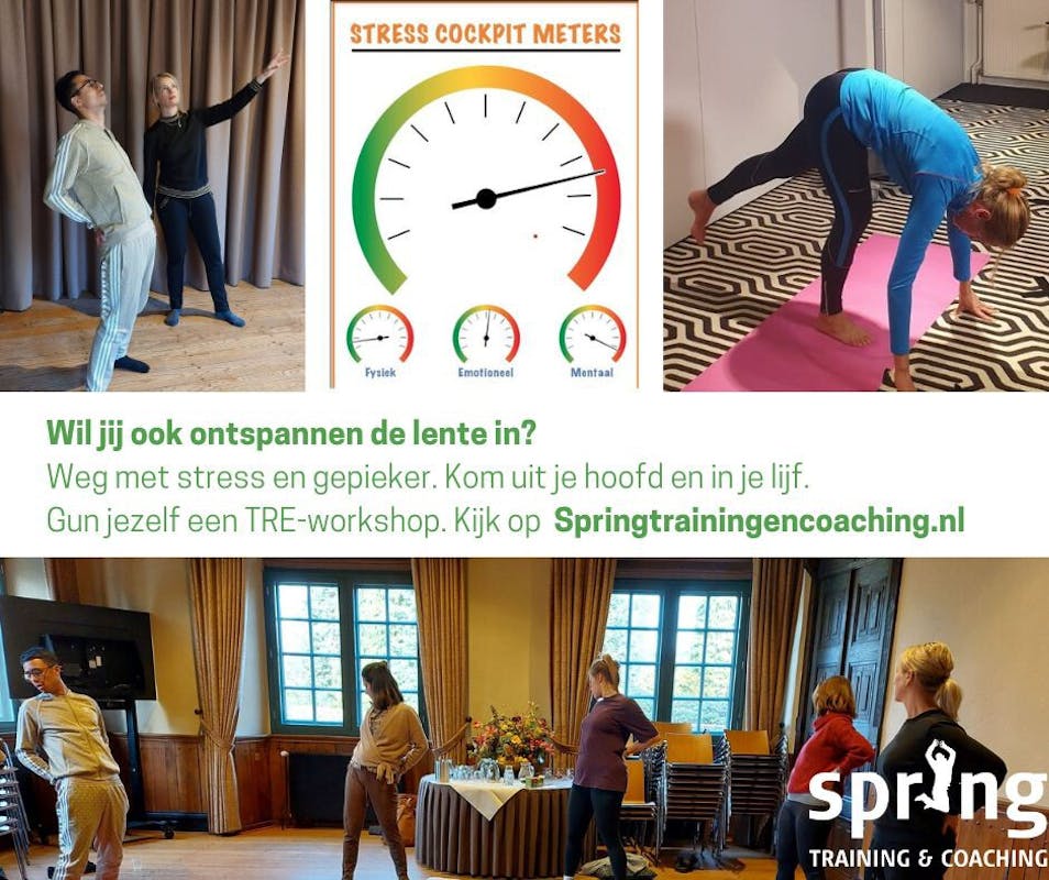 Druk-druk-druk? Blijf je maar piekeren en doorhollen? Weet je niet meer hoe je moet ontspannen? Gelukkig weet je lijf het nog wel. Ontdek in een TRE-workshop hoe je op een eenvoudige manier je lijf weer kunt ontspannen. Waardoor de energie terugkomt, je meer plezier ervaart en makkelijker je eigen grenzen bewaakt. TRE staat voor trauma & tension releasing exercises en is een wereldwijd gebruikte methode om jouw eigen herstelmechanisme weer te activeren. Doe je TRE, dan schudt de spanning letterlijk van je af. Je herstelt je vitaliteit, voelt weer verbinding met je lichaam en herkent stress signalen eerder in het dagelijks leven. Gun jezelf die reset en doe mee op 21 april, 10 mei, 19 mei, 9 juni of 21 juni. Schrijf je in via: springtrainingencoaching.nl
