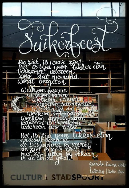 Speeltuin de Langehorst maakt zich op om de kinderen een gezellige middag te bezorgen in verband met het Fitr feest. Eerder dichtte stadsdichter dit mooie gedicht. Te lezen op de ramen in de stad.