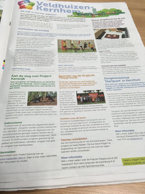 Laatst vroeg een bewoner mij: ‘ wat doen de jeugdwerkers in de wijk?’ Een vraag die voortkomt uit terechte nieuwsgierigheid. Want je ziet ze niet maar ze zijn er wel. Dagelijks hebben ze contact met jongeren en met hun ouders. Ook organiseren ze activiteiten in de wijk. Van heel serieuze activiteiten zoals studiebegeleiding in het Kernhuis, tot hele leuke zoals een potje voetbal of gezellig chillen. Steeds kijken jeugdwerkers waar behoefte aan is en hoe ze de jongere kunnen helpen. Daarom verdienen onze jeugdwerkers een pagina in de krant Ede stad van vandaag. Met daarin een aantal activiteiten uitgelicht. Meer weten? Neem gerust contact met mij op via