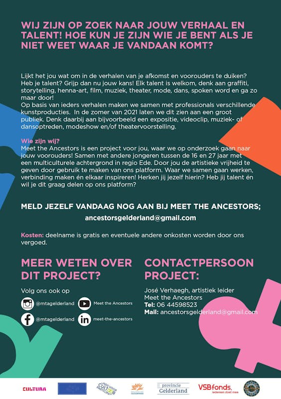 Ben jij tussen de 16 en 27 jaar oud en kom je uit regio #Ede en heb je een multiculturele achtergrond? Lijkt het jou wat om in de verhalen van jouw afkomst en voorouders te duiken en heb je talent? Grijp dan nu jouw kans! Elk talent is welkom