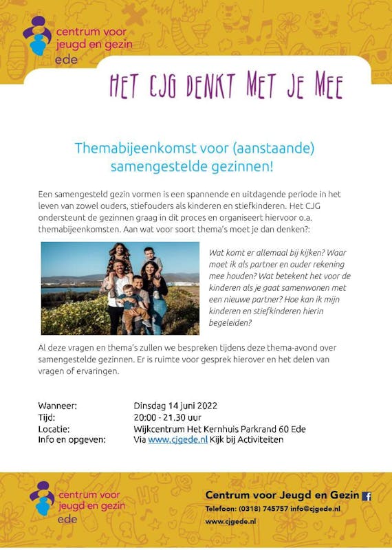 Al deze vragen en thema’s zullen we bespreken tijdens deze thema-avond over samengestelde gezinnen. Er is ruimte voor gesprek en het delen van vragen en ervaringen.